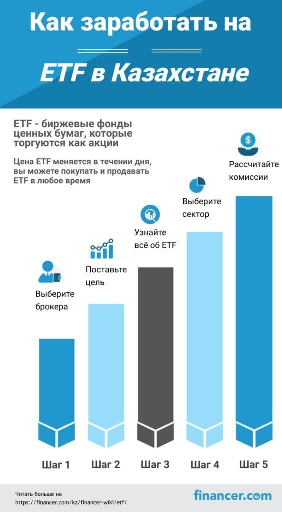 На казахстанской бирже вы можете купить ETF на индексы KASE под тикером IE_FXBF, такой фонд торгуется в тенге, что удобно. А также ETF на индексы американской биржи, который включает индексы 500 самых крупных американских компаний, тикер US_SPY_. Цена фонда будет меняться вместе с ценой акций компаний, которые входят в фонд Выбирая международного брокера, вы можете получить доступ к другим ETF на акции, на индексы, на облигации и прочее.