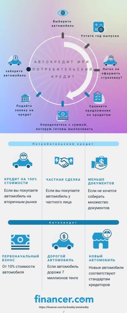 Если вы хотите купить автомобиль у частного лица.Большинство автомобилей, купленных в Казахстане, приобретаются через поиск в интернете. С автокредитом также можно купить подержанный автомобиль, но гораздо легче это сделать с помощью потребительского кредита. В данном случае кредитору неважна цель кредита и именно поэтому можно получить кредит на покупку автомобиля** любого года выпуска и в любом состоянии**.